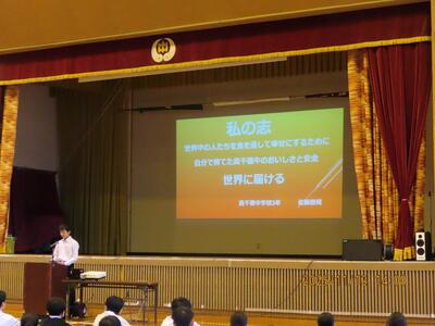 11月30日(日)、京都府で開催された『第8回世界青少年「志」プレゼンテーション大会』に出場しました。自分の「志」を5分間で発表していく大会ですが、3,794名中から12名のファイナリストに選ばれての出場です。樹規さんの志は、「世界中の人に自分で育てた高千穂牛を食べてもらい、職を通して幸せにする」です。どの出場者もすばらしい発表でしたが、樹規さんも負けずに堂々とした発表でした。夏休みの予選会から3ヶ月。文章を練り直したり、繰り返し発表の練習をしたりと努力を重ねてきた成果を出せ、大きく成長できた大会となりました。