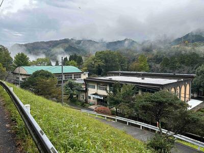 本日の学校の写真です。自然に囲まれたところにあります。体育館の少し奥に見える雲は、目線と同じくらいの高さにあり、雲海のような広がりはありませんが、幻想的な風景です。天気は曇りでひんやりします。来週は最低気温マイナス3度の予報も出ています。一気に冬を迎えそうな気配がします。