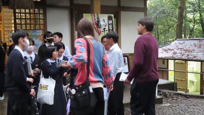 11月13日(木)に宮崎公立大学の留学生21名の観光案内を3年生が行いました。各グループ10人の中に留学生2~3名が入り、高千穂神社を散策したり、城山公園までを道案内したりしながら、英語での会話にチャレンジしました。緊張したり、難しかったりしたでしょうが、伝わったときの喜び、外国の人との交流の楽しさなどがこれからの英語の授業や異文化に触れることへの関心につながってほしいです。3年生は11日に熊本大学の留学生とも交流し、英語をたくさん使った1週間となりました。