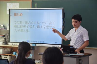 11月14日(金)、3年生は総合的な学習の時間に、今まで調べ学習をしてきたグループごとに発表会を行いました。高千穂町内外、様々な方々と関わりながら、そして支援をいただきながら進めてきました。今回の発表で10グループが選ばれ、さらに、11月28日に2次選考会を開き、そこで選ばれた5グループが、高千穂町役場で町長はじめ各課課長の方々にご提案します。中学生の発想力と行動力は大人にはない魅力があります。その魅力を伝え、実現される提案が1つでも出てくるといいです。