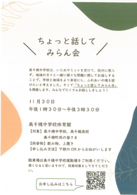 11月30日(日)に予定しておりました地域との方々との座談会「ちょっと話してみらん会」は、本校の感染症の影響により中止とさせていただきます。生徒会が中心となって準備を進めてきましたので非常に残念ではありますが、参加者への感染があってはなりませんので決断いたしました。参加の予定であった皆様とお会いできるのを心待ちにしておりましたが、大変申し訳ございません。ご理解のほどよろしくお願いいたします。