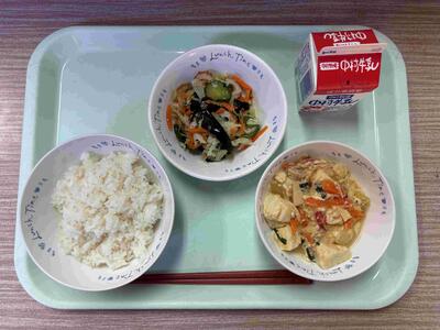 〈 麦ごはん 牛乳 厚揚げの中華煮 きくらげの酢の物 〉