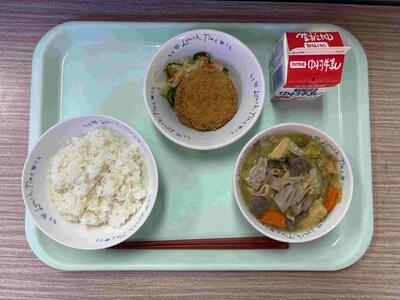 〈 麦ごはん 牛乳 ミンチカツ ゆず和え かぼちゃの豚汁 〉