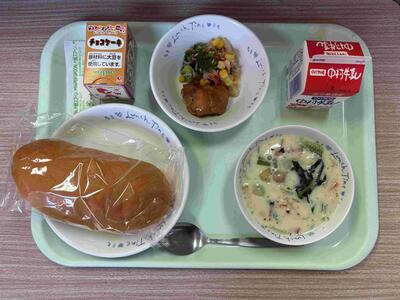 〈 麦ごはん 牛乳 たこやき風 野菜スープ 〉