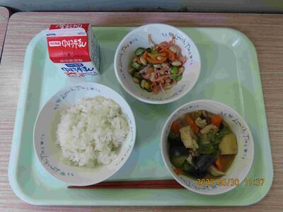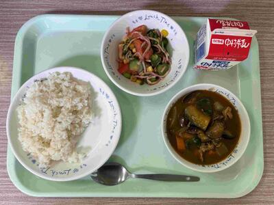 みなさんは夏バテはしていませんか?暑さで食欲が落ちる時期です。給食ではみなさんの食欲が出るよう工夫しています。にんにくやしょうがなどの薬味をきかせた料理やカレーなどの香辛料を使った料理は食が進みます。酢やレモン、梅などを使った酸っぱい料理は疲れをとる効果もあり、おすすめです。2学期初めの献立はみなさんが暑い中で美味しく食べてくれるようにという思いをこめて作っています。今日は香辛料と夏野菜をたっぷり使用したカレーライスです。暑い夏も元気に過ごしましょう。