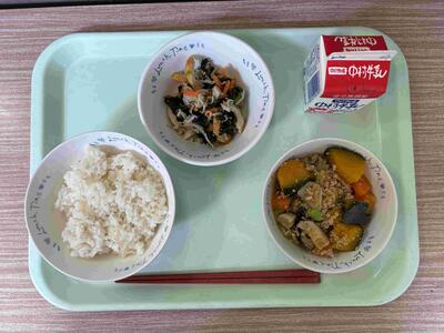 〈 麦ごはん 牛乳 かぼちゃのそぼろ煮 小松菜のごま酢和え 〉
