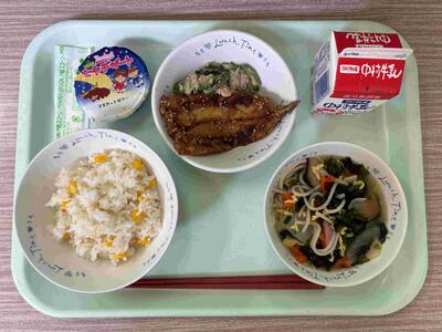 〈 コーンごはん 牛乳 いわし蒲焼 ゴーヤサラダ 七夕汁 七夕ゼリー 〉