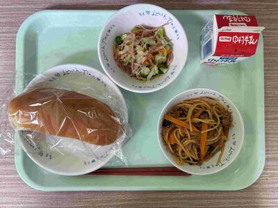 〈 減量コッペパン 牛乳 なすとひき肉のスパゲティ 青豆サラダ 〉