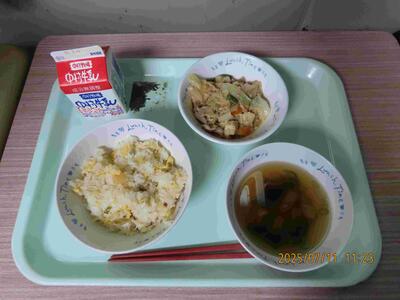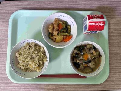 〈 釜入り茶飯 牛乳 鶏肉とゴーヤの揚げ煮 なすのみそ汁 〉