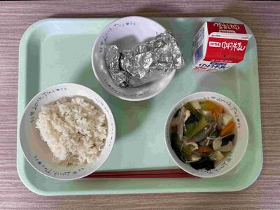 〈 麦ごはん 牛乳 魚のみそマヨホイル蒸し 鶏ごぼう汁 〉