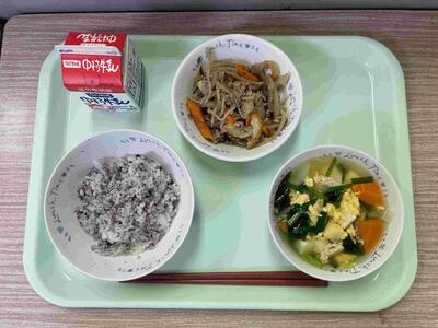 〈 ゆかりごはん 牛乳 きんぴらごぼう にらたま汁 〉