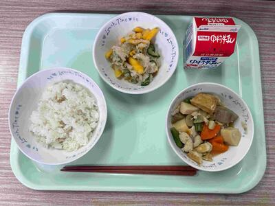 〈 とうきびごはん 牛乳 椎茸とカシューナッツの揚げ煮 さつま汁 〉