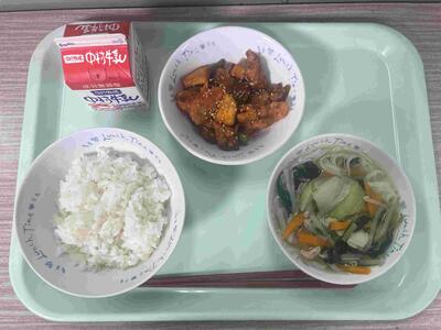 〈 茶飯 牛乳 とり肉とゴーヤの揚げ煮 なすのみそ汁 〉