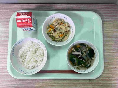 〈 ゆかりごはん 牛乳 きんぴらごぼう にらたま汁 〉