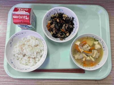 < 麦ごはん 牛乳 ひじきのいり煮 魚のみそ汁 >