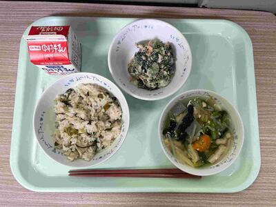 〈 高菜ごはん 牛乳 ごまネーズサラダ 野菜のそぼろ汁 〉