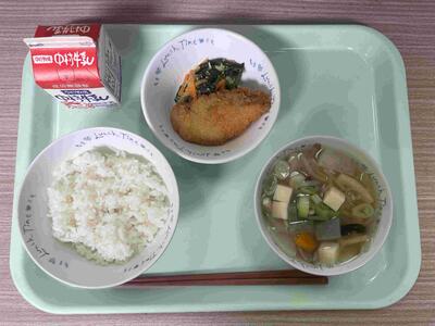 〈 麦ごはん 牛乳 あじフライ ごま和え けんちん汁 〉