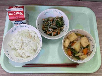 〈 麦ごはん 牛乳 鶏肉と大豆の煮物 ほうれん草のおかか和え 〉