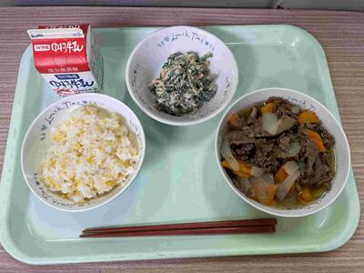 〈 減量とうきびごはん 牛乳 高千穂牛肉うどん ごまネーズサラダ 〉