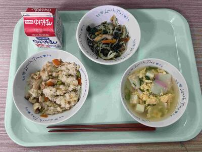 〈 千切り大根の炊き込みごはん 牛乳 かきたま汁 千草あえ 〉