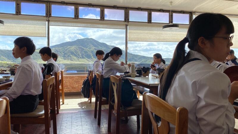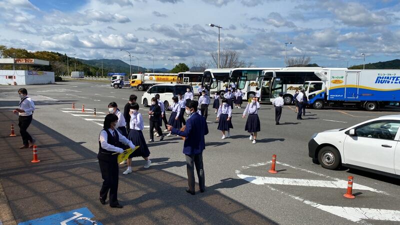武道館からバス3台、途中上野中バス1台で出発 最初の見学地阿蘇火山博物館