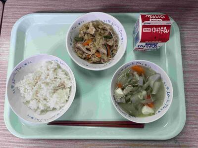 〈 麦ごはん 牛乳 豚肉とキャベツのピリ辛炒め まめまめサラダ 〉