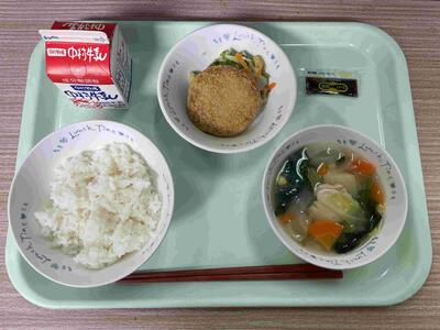 〈 千切り大根の炊き込みごはん 牛乳 かきたま汁 千草あえ 〉