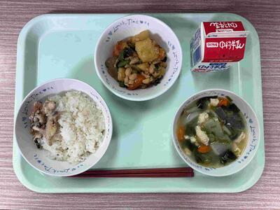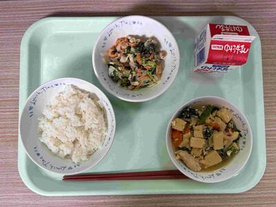 〈 麦ごはん 牛乳 高野豆腐の卵とじ 磯マヨネーズ和え 〉