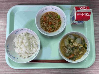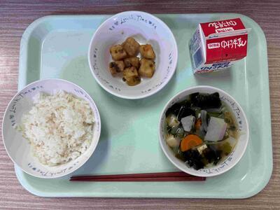 〈 麦ごはん 牛乳 かりかりなばちゃん 五目豆 かみなり汁 〉
