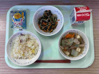 〈 くりごはん 牛乳 あじの風味漬け きのこの山里汁 〉