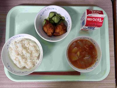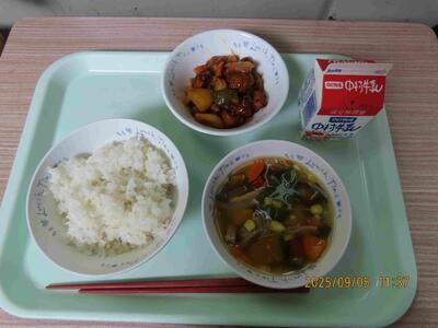 〈 麦ごはん 牛乳 酢豚 カラフル夏野菜スープ 〉