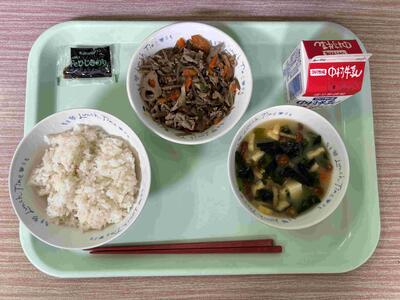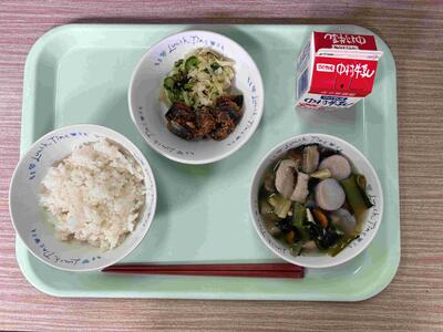 〈 麦ごはん 牛乳 のりの佃煮 きんぴらごぼう なめこのみそ汁 〉