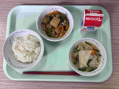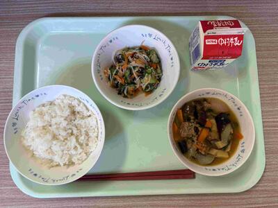 〈 麦ごはん 牛乳 豚肉となすのうまみそ炒め ワンタンスープ 〉