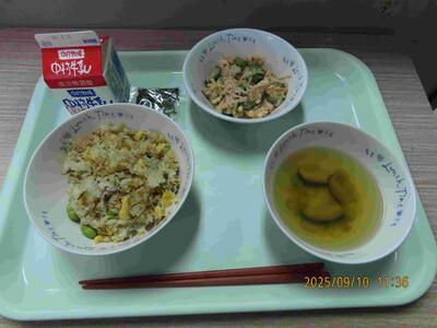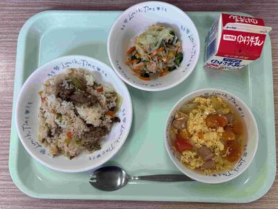〈 高千穂牛とレタスのピラフ 牛乳 トマトと卵のスープ ツナコーンサラダ 〉