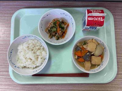 〈 麦ごはん 牛乳 いわしの変わり揚げ 昆布あえ のっぺい汁 〉