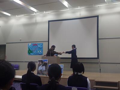 2月1日(日)に宮崎市の宮交シティにて「第6回宮崎県中学生北方領土に関する作文コンクール」の表彰式が行われ、本校からは藤野由依さんが最優秀賞、吉永理乃さんが優秀賞を受賞しました。県内で最優秀賞、優秀賞合わせて4名の中に高千穂中から2名選ばれ、さらに藤野さんは、全国5,923作品中10作品に選ばれ、2月21日に東京都で開催される「令和7年度北方領土に関する全国スピーチコンテスト最終選考会」に参加することになりました。自信もって堂々と発表してきてほしいです。