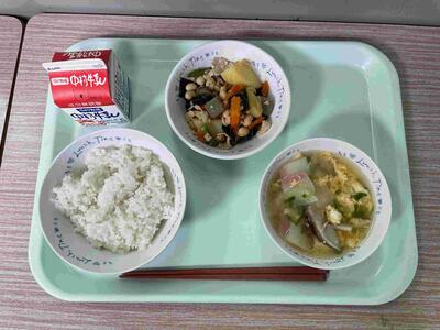 〈 麦ごはん 牛乳 五目豆 かきたま汁 〉