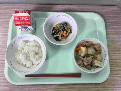 〈 麦ごはん 牛乳 豚肉とれんこんの炒め煮 千草あえ 〉