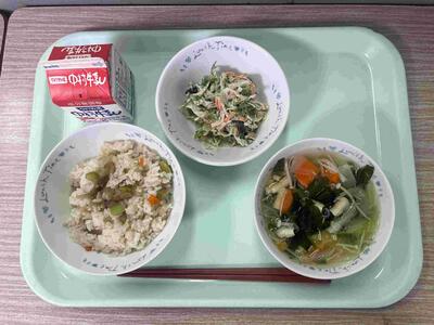 〈 鶏めし 牛乳 磯マヨネーズ和え 五目スープ 〉