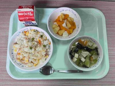 < チャーハン 牛乳 五目豆腐スープ フルーツ杏仁豆腐 >