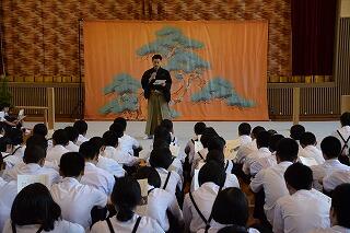 前回のワークショップと今回の上演で、能・狂言についてはじめて体験することができた生徒が多いようでしたが、関心を持って閑かに鑑賞し,楽しく過ごすことができたようです。
