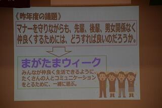 あいさつの種類をクイズで聞かれ、答えを発表しています。