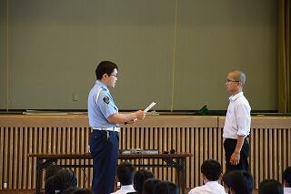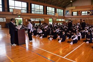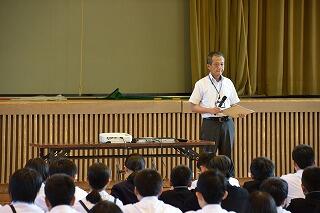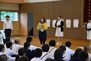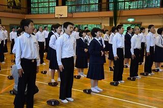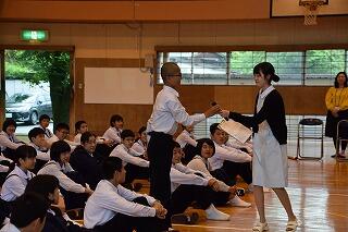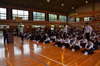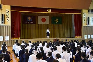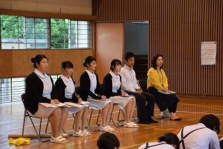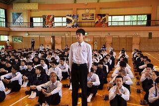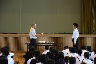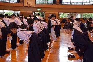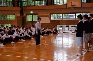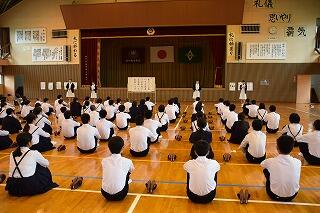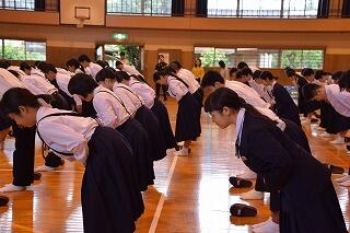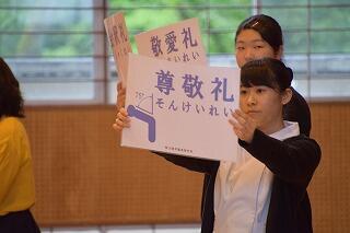 宮崎市の日章学園高等学校の先生と生徒に来ていただき、声の出し方からあいさつや何通りもの礼の仕方まで、具体的に指導してもらいました。