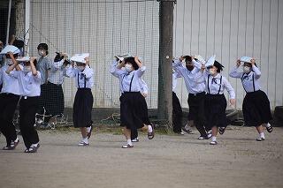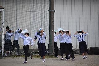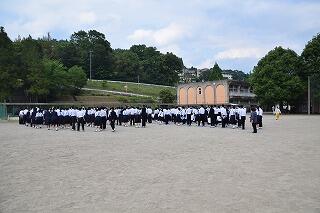 本校は、高千穂峡の上にあり、がけ崩れなどの心配もあるために、グランドで人数を確認した後は高千穂高校の第2グランドまで移動します。