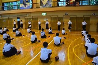 体育館のフロアに生徒一人一人の間隔を大きくとりながら広がり、窓は換気のために全開しています。