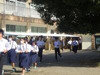 10月10日(火)の6校時に避難訓練を実施しました。今回は多目的教室2で火災が発生することを想定した訓練でした。教頭先生による出火の放送の後に生徒が運動場に避難してきました。全校生徒が240名という中規模校で校舎もすべてが2階建てという避難に有利な造りではありますが、南側は高千穂峡。土砂災害危険区域にも指定されている本校。火元から離れて避難していくのが火災時の避難の原則ですが、その方向は3方向に限られます。中学校移転の話も進んではいるものの、完成まではまだまだ数カ年を要するため、しばらく、現在の学校で訓練を終