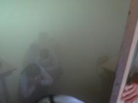 えさせました。基本は「火元から離れて避難する」です。また、「自分の命は自分で守る」ことを最優先させた避難をすることを指導しました。西臼杵広域消防から来られた講師の方々から説明を受けた後、煙体験を行いました。火元である多目的教室2は煙(訓練なので甘い匂い)が充満していました。10名前後の集団でその中に入りましたが、視野が狭くなり、なかなかの臨場感を味わうことができたと思います。最後に全員体育館に集まり講師の方から講話をいただきました。火災の原因のトップは、煙草の火の不始末とのこと。人為的なもので人間の意識により十分防ぐことができるものです。