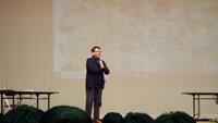 さて、その氏による「特別授業」だが、本校からは全生徒、職員が参加し、4名の生徒が壇上で実際に授業を受けさせていただいた。