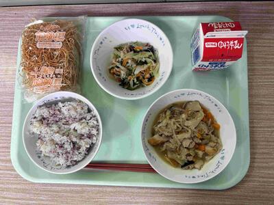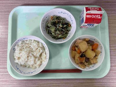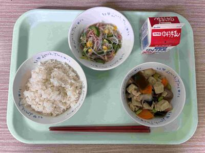 〈 麦ごはん 牛乳 高野豆腐と昆布の炒り煮 春雨サラダ 〉