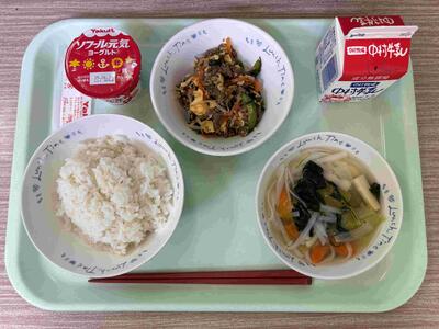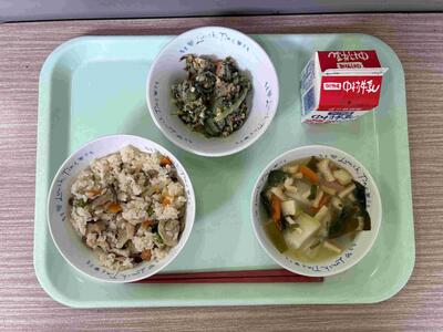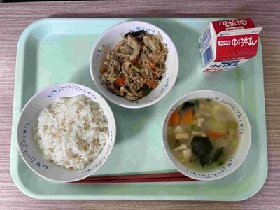 〈 鶏五目ごはん 牛乳 冬瓜のみそ汁 納豆サラダ 〉